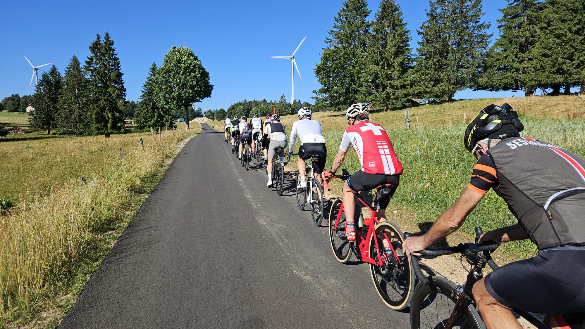 Am nächsten Morgen starteten wir um 9 Uhr zur letzten Etappe unserer Tour. Wir fuhren an einigen mächtigen Windrädern vorbei hinauf zum Col de l’Aiguillon. Danach erwartete uns eine lange Abfahrt nach Baulmes, mit herrlicher Aussicht über die Wiesen und Felder des Waadtlands. Im Hintergrund waren die verschneiten Berge der französischen Alpen zu erkennen.